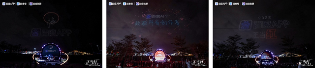 活动现场星光熠熠,著名配音演员张震、当红短剧演员、全网头部创作达人、知名AI创作领域机构代表、还有风格各异的贴吧吧主受邀出席,展现出AIGC内容创作者的实力与风采。无人机表演将活动氛围推向高潮,“百度APP”与“正当红”巨型标识在夜空中浮现,用科技与光影,点燃了这场属于AIGC创作者的内容盛宴。