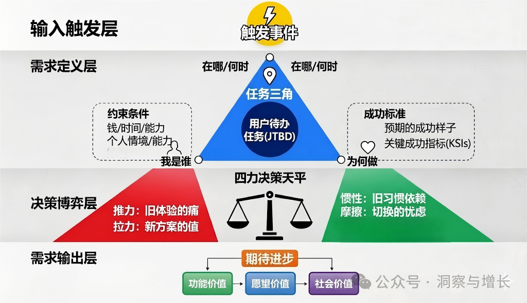 这张基于 JTBD 的用户需求洞察天枰模型图,不仅是一个分析工具,