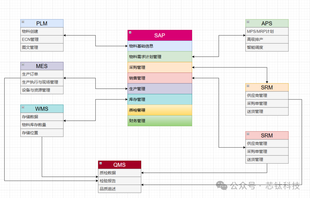 我以SAP中为例给大家画出了MES、WMS 、PLM、QMS 、CRM、SRM和SAP的基础交互,首先保证物料的统一性,BOM的完整性 。出入库行为的一致性。