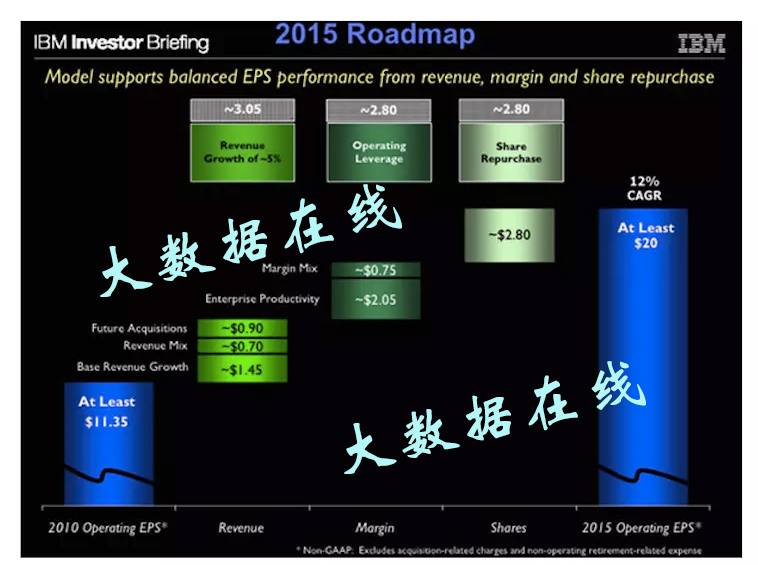 IBM每股收益3.68美元远低于分析师预期,分析师预计每股收益4.32,IBM随即宣布放弃2015年每股收益达到20美元的长期目标--“2015年路线图。”公司的管理层表示市场变化之快超过他们预期。